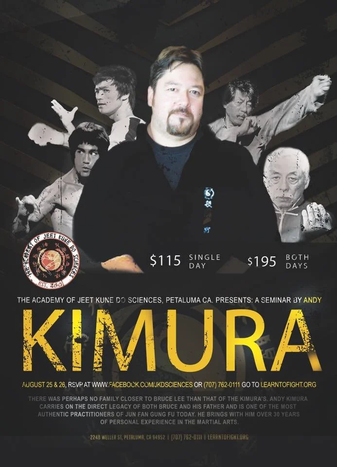 Have a seminar featuring the head of Jun Fan Gung Fu, Sifu Andy Kimura. Learn Jun Fan Gung Fu directly from the notebook of Bruce Lee.